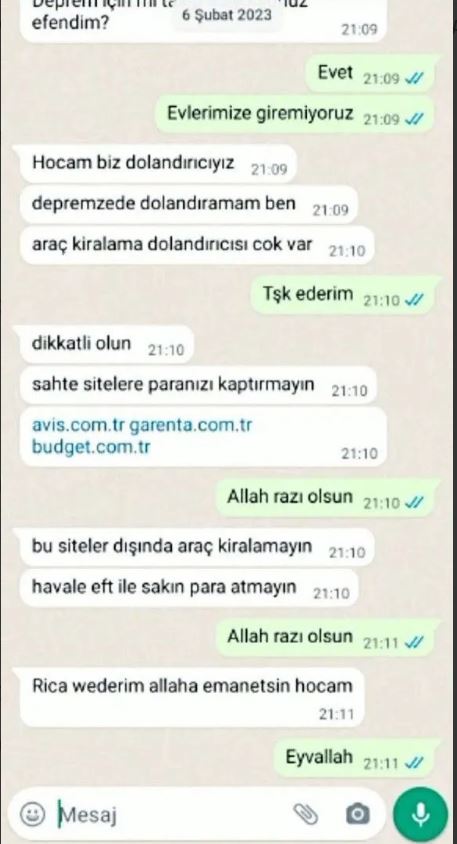 Dolandırıcı ile vatandaş arasındaki diyalog herkesi hayrete düşürdü. Konuştuğu kişinin depremzede olduğunu anlayan dolandırıcı mesajda, “Hocam biz dolandırıcıyız. Ben depremzede dolandıramam. Araç kiralama dolandırıcısı çok var. Dikkatli olun. Sahte sitelere paranızı kaptırmayın. Havale ve EFT ile sakın para atmayın. Allaha emanet olun” yazdı.