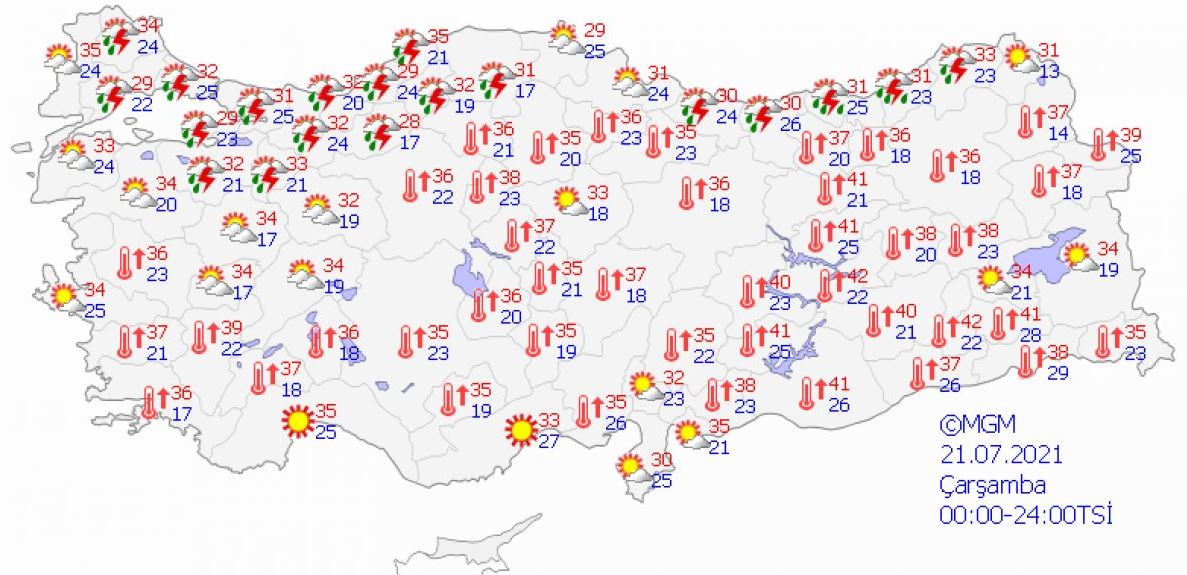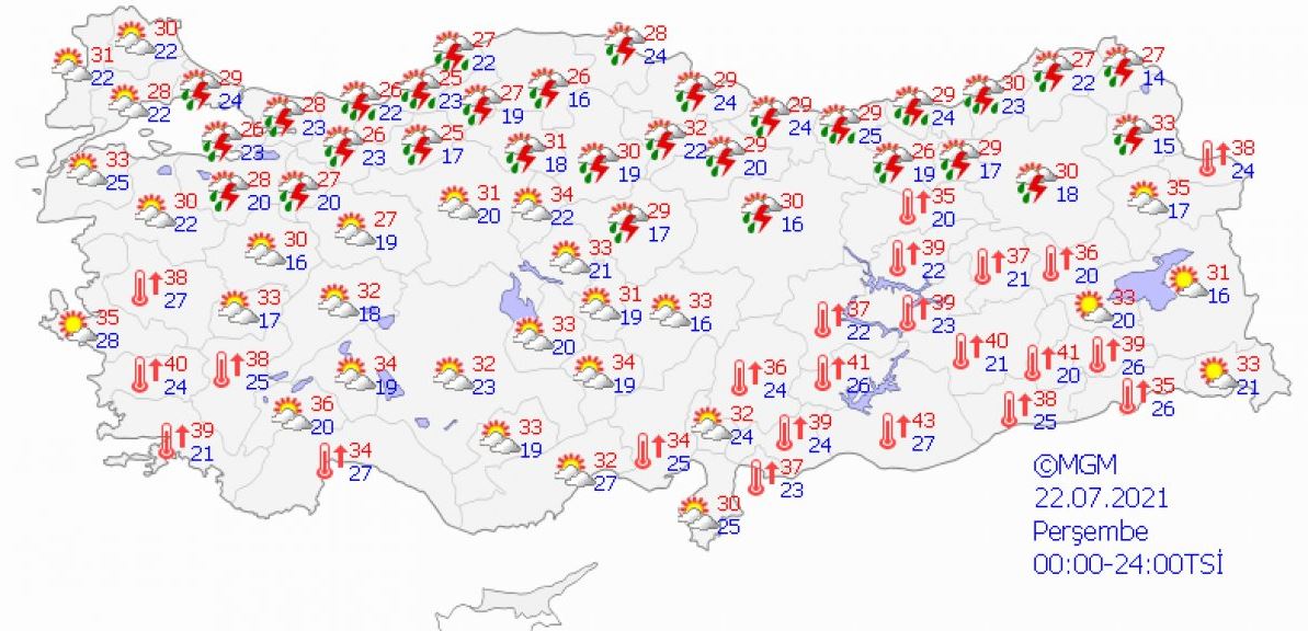 Bayramın dördüncü gününde Karadeniz, Doğu Anadolu'nun kuzeyi ile Akdeniz'in iç kesimlerinde yer yer gök gürültülü sağanağın yanında diğer yerlerde hava az bulutlu ve açık olacak.