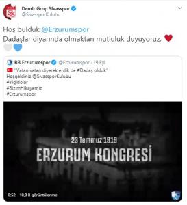Büyükşehir Belediye Erzurumspor’un bu mesajına Sivasspor’un cevabı ise; “Hoş bulduk Erzurumspor. Dadaşlar diyarında olmaktan mutluluk duyuyoruz” oldu.