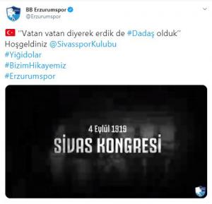 Erzurumspor sosyal medya hesabından, şehre ayak basan Sivasspor’a hoş geldin mesajı yayımladı. Erzurum temsilcisi, paylaşımında Erzurum Kongresi ve Sivas Kongresi’nin yer aldığı videoyu paylaşarak, “Vatan vatan diyerek erdik de Dadaş olduk. Hoş geldiniz Sivasspor Kulübü” ifadelerini kullandı.
