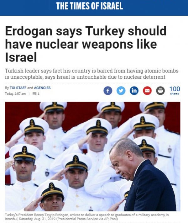 Times of Israel, haberi, "Erdoğan, Türkiye’nin de İsrail gibi nükleer silahları olması gerektiğini söyledi" başlığıyla duyururken, İsrail’in nükleer silahlar nedeniyle dokunulmaz olduğunu ima eden yorumlarda bulundu.