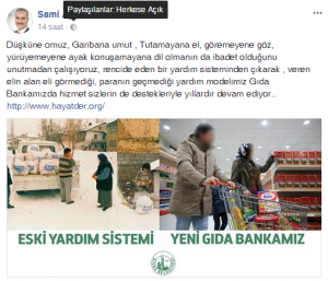 "Düşküne omuz, Garibana umut , Tutamayana el, göremeyene göz, yürüyemeyene ayak konuşamayana dil olmanın da ibadet olduğunu unutmadan çalışıyoruz, rencide eden bir yardım sisteminden çıkarak , veren elin alan eli görmediği, paranın geçmediği yardım modelimiz Gıda Bankamızda hizmet sizlerin de destekleriyle yıllardır devam ediyor.."