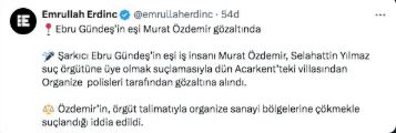 Gazeteci Emrullah Erdinç’in sosyal medya hesabından duyurduğu bilgiye göre Murat Özdemir, “suç örgütüne üye olmak” suçlamasıyla Acarkent’teki villasından Organize Şube ekiplerince gözaltına alındı. Özdemir’in, örgüt talimatıyla organize sanayi bölgelerine çökmekle suçlandığı iddia edildi.