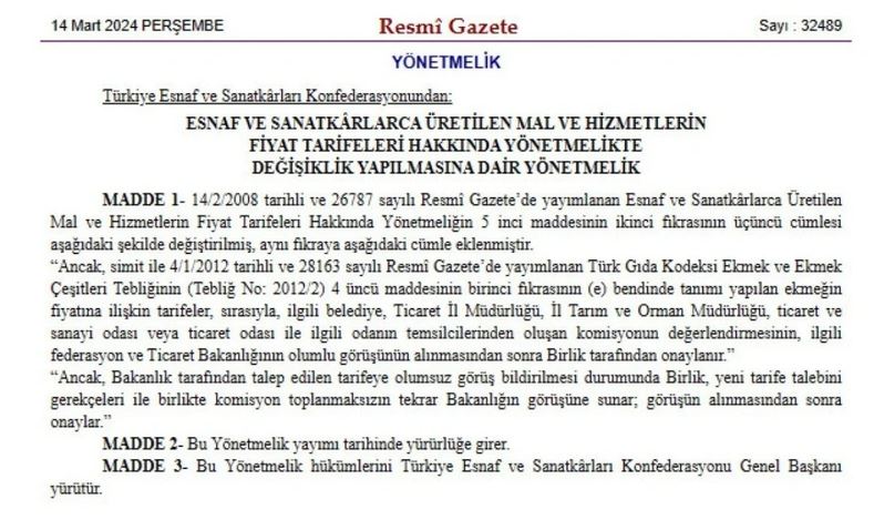 Resmi Gazete'de yayınlanan karara göre, ekmek ve simit fiyatlarının belirlenmesinde artık bakanlığın olumlu görüşü alınacak. Böylelikle, Sivas'ta yerel yetkililer tarafından yapılan zamlar artık istendiği her an yapılamayacak ve temel besin gıdalarındaki fahiş zamların önüne geçilecek.