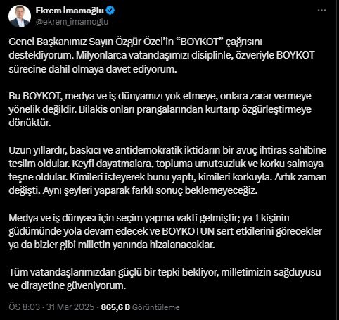 İmamoğlu paylaşımında, boykotun medya ve iş dünyasını hedef almadığını, aksine onların özgürleşmesine yönelik bir adım olduğunu belirtti. Açıklamasında şu ifadelere yer verdi: