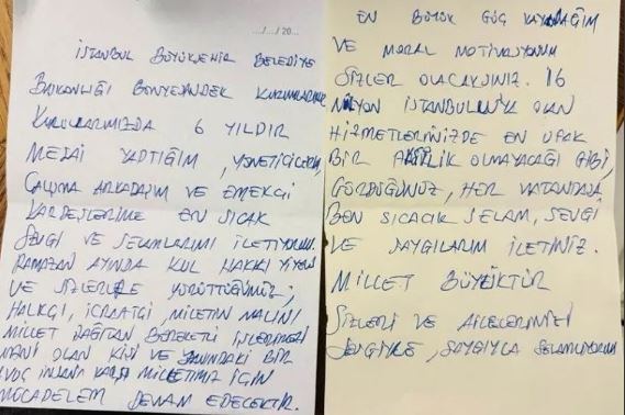İmamoğlu mesajında, “En büyük güç kaynağım ve moral motivasyonum sizler olacaksınız. 16 milyon İstanbulluya olan hizmetlerinizde en ufak bir aksilik olmayacağı gibi gördüğünüz her vatandaşa benim sıcak selam ve saygılarımı iletiniz. Millet büyüktür.” ifadelerini kullandı.