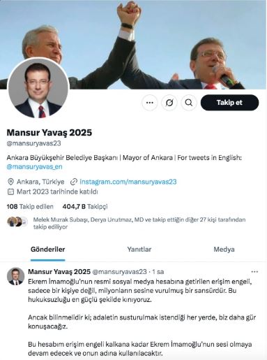 Erişim engeli kararı sonrası İmamoğlu’nun 10 milyona yakın takipçiye sahip olan hesabına Türkiye sınırları içerisinden ulaşılamıyor. Kararın ardından sosyal medyada tepkiler yükselirken, en dikkat çekici tepki Ankara Büyükşehir Belediye Başkanı Mansur Yavaş’tan geldi.