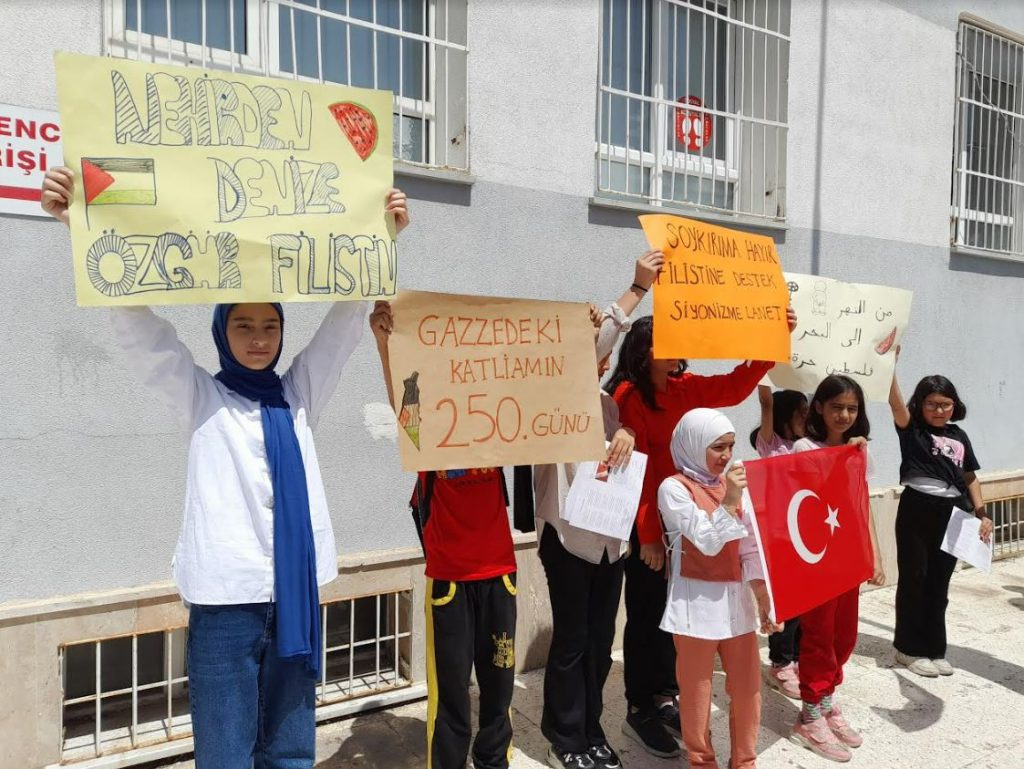 Elçibey İmam Hatip Ortaokulu öğrencileri karne töreninde Gazze’de yaşanan soykırıma dikkat çekmek için anlamlı bir etkinliğe imza attı.
