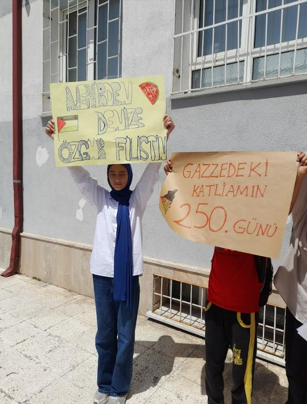Ellerinde Gazze, Kudüs ve Mescid-i Aksa ile ilgili dövizler ile törene katılan öğrenciler dünyanın gözü önünde 250 gündür devam eden soykırımın sona ermesini istediler.