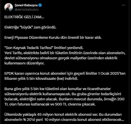 “Enerji Piyasası Düzenleme Kurulu dün önemli bir karar aldı. 'Son Kaynak Tedarik Tarifesi' limitleri yenilendi. Yeni Tarife, elektrikte belirli bir tüketim limitinin üzerinde olan abonelerin, devlet sübvansiyonu olmaksızın gerçek maliyetler üzerinden elektrik kullanmasını düzenliyor.