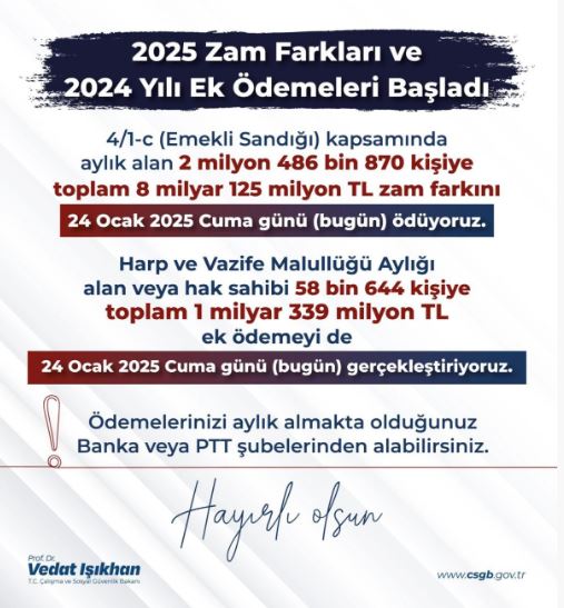 Çalışma ve Sosyal Güvenlik Bakanı Vedat Işıkhan, X hesabından yaptığı açıklamada, "Emekli Sandığı kapsamında aylık alanların 2025 yılı zam farkları ile Harp ve Vazife Malullüğü aylığı alan vatandaşlarımızın 2024 yılı ek ödemelerini bugün hesaplarına yatırıyoruz. Vatandaşlarımıza ve kıymetli ailelerine hayırlı olmasını diliyorum." dedi.