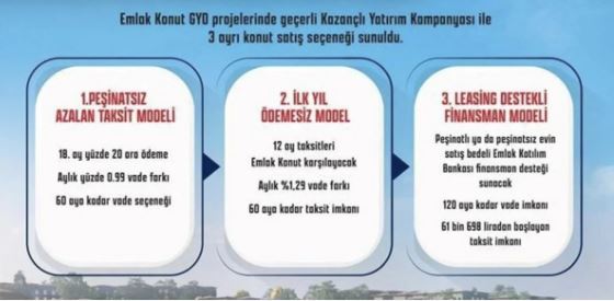 - Bir yıl ödemesiz model: İlk 12 ay taksit ödemeleri Emlak Konut tarafından karşılanacak, böylece alıcılar yüzde 12 oranında kazanç sağlayacak. 60 aya kadar yüzde 1,29 vade farkı uygulanacak.