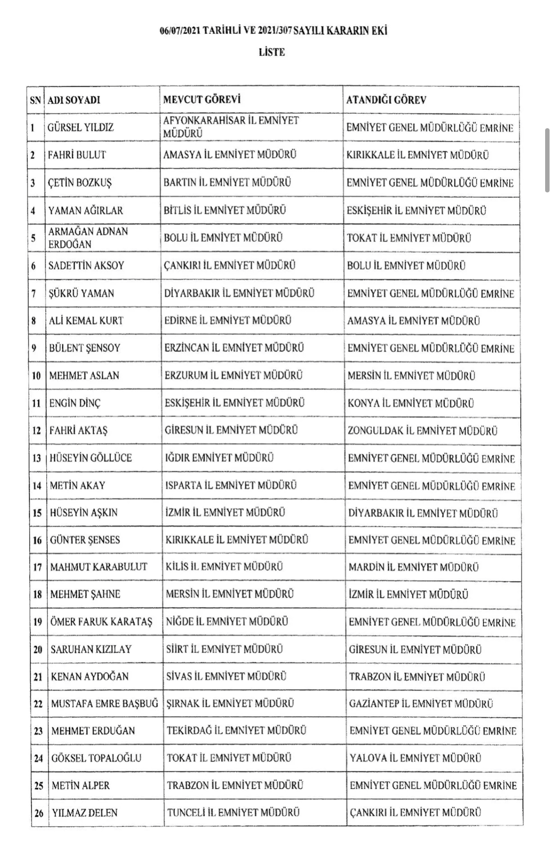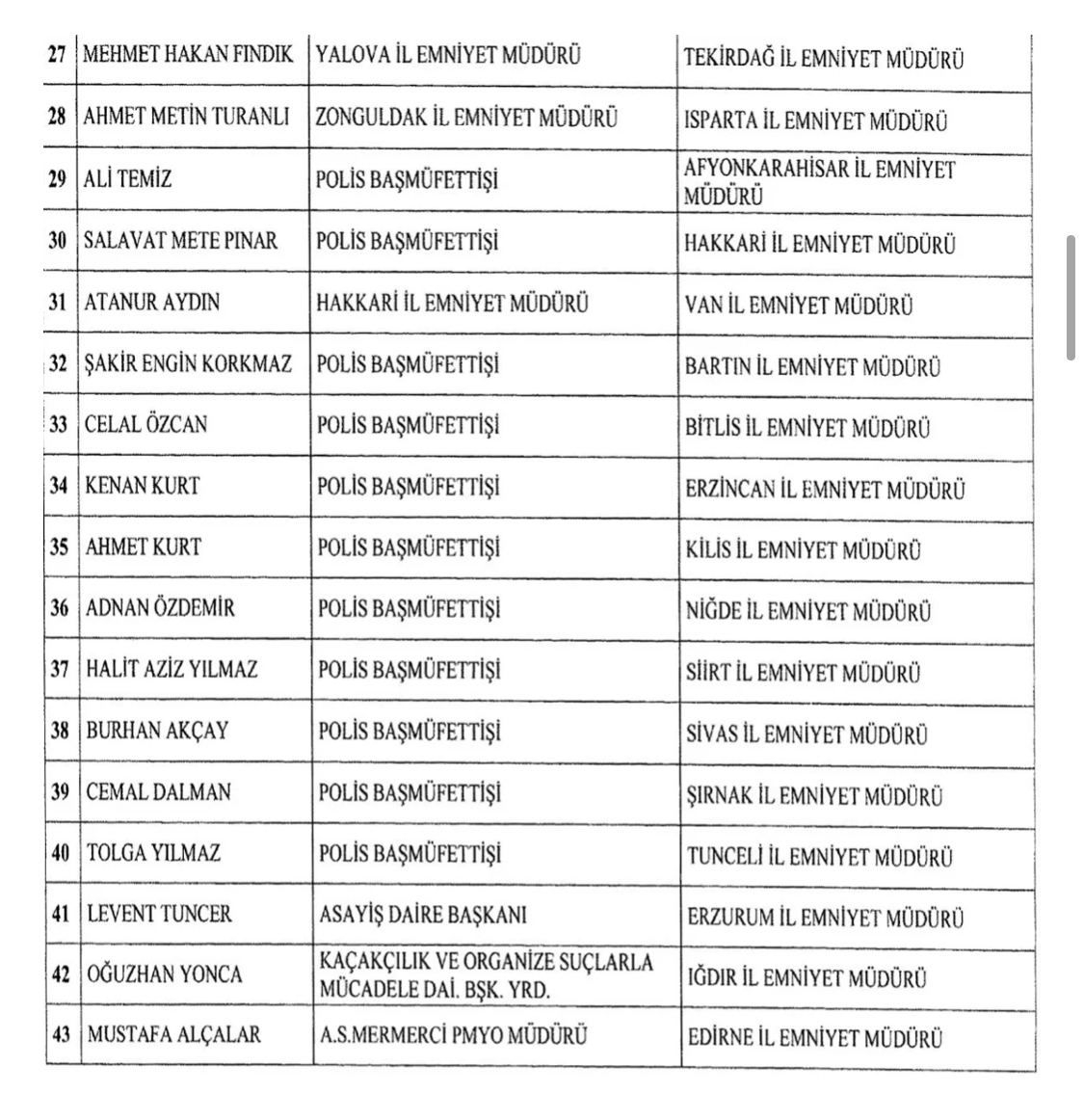 Resmi Gazete’de yayınlanan Emniyet Müdürleri Kararnamesi ile İzmir İl Emniyet Müdürü Hüseyin Aşkın, Diyarbakır Emniyet Müdürü olarak atanırken, Mersin Emniyet Müdürü Mehmet Şahne İzmir Emniyet Müdürü olarak atandı. Trabzon Emniyet Müdürlüğüne de Sivas İl Emniyet Müdürü Kenan Aydoğan, atandı. Karara göre illere yapılan atama şöyle: