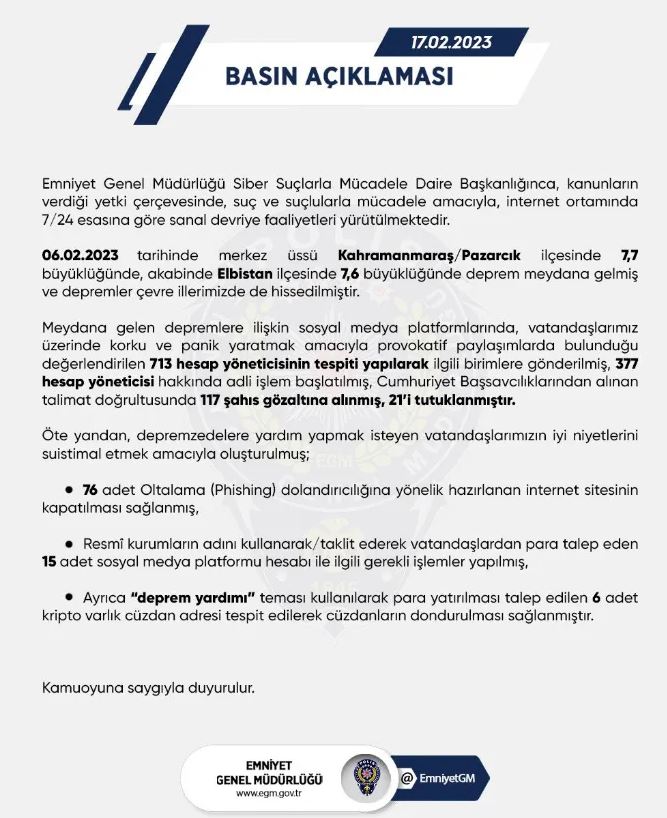 EGM: "Sosyal medya platformlarında depreme ilişkin provokatif paylaşımlarda bulunan 651 hesap yöneticisi tespit edildi, 330'u hakkında adli işlem başlatıldı. 110 şahıs gözaltına alındı, 21'i tutuklandı"