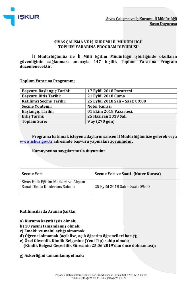 "Tüm Türkiye'de okullara alınacak olan Güvenlik Görevlilerinde en az lise mezunu olma şartı kaldırılmış ve aranmazken Sivas'ta bu şartın halen aranıyor olması tepki topluyor" şeklinde yayınladığımız haber sonrası hafta sonu olmasına rağmen İşkur yetkililerinden konuya müdahale geldi.