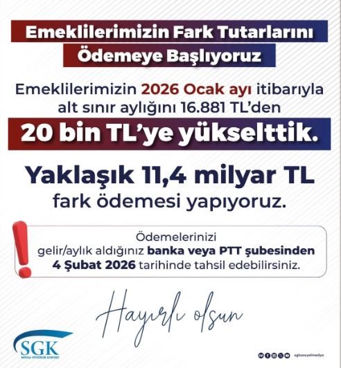 “Emeklilerimize ve hak sahiplerine fark tutarlarını ödüyoruz. Ödemelerinizi gelir/aylık aldığınız banka ve PTT şubesinden çekebilirsiniz. 4 Şubat 2026 tarihinde tahsil edebilirsiniz.”