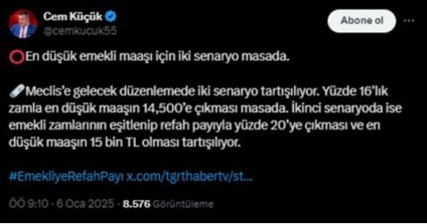 12 bin 500 TL olarak uygulanan en düşük emekli maaşı düzenlemesi için kabineden çıkacak karar merak ediliyor. Gazeteci Cem Küçük en düşük emekli maaşı için masadaki 2 senaryoyu açıkladı.