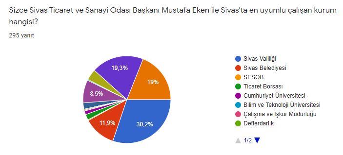 Araştırmada Sivaslılara sorulan "Sizce Sivas Ticaret ve Sanayi Odası Başkanı Mustafa Eken ile Sivas'ta en uyumlu çalışan kurum hangisi?" sorusuna Sivaslılar % 30,2 Sivas Valiliği derken, % 11,9 oranında ise Sivas Belediyesi dedi.