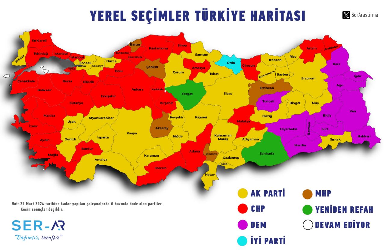 Yerelde ve ulusalda anketler yayınlanmaya devam ediyor... Sosyal medya hesabından Ser Araştırma (SER-AR) yayınladığı anket ile 22 Mart tarihine kadar yapılan seçim araştırmasını paylaştı.