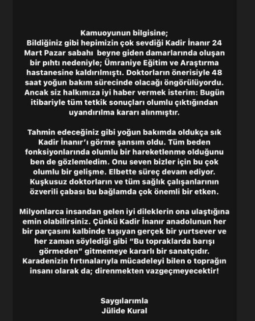 "Kamuoyunun bilgisine; Bildiğiniz gibi hepimizin çok sevdiği Kadir İnanır 24 Mart Pazar sabahı beyne giden damarlarında oluşan bir pıhtı nedeniyle; Ümraniye Eğitim ve Araştırma Hastanesi'ne kaldırılmıştı. Doktorların önerisiyle 48 saat yoğun bakım sürecinde olacağı öngörülüyordu. Ancak siz halkımıza iyi haber vermek isterim: Bugün itibariyle tüm tetkik sonuçları olumlu çıktığından uyandırılma kararı alınmıştır.