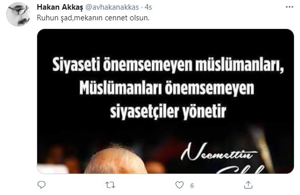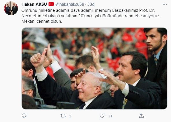 Hakan Aksu "Ömrünü milletine adamış dava adamı, merhum Başbakanımız Prof. Dr. Necmettin Erbakan’ı vefatının 10'uncu yıl dönümünde rahmetle anıyoruz. Mekanı cennet olsun."