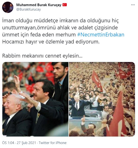 M. Burak Kuruçay "İman olduğu müddetçe imkanın da olduğunu hiç unutturmayan, ömrünü ahlak ve adalet çizgisinde ümmet için feda eden merhum #NecmettinErbakan Hocamızı hayır ve özlemle yad ediyorum. Rabbim mekanını cennet eylesin..."