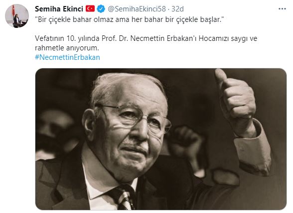 Semiha Ekinci ""Bir çiçekle bahar olmaz ama her bahar bir çiçekle başlar." Vefatının 10. yılında Prof. Dr. Necmettin Erbakan'ı Hocamızı saygı ve rahmetle anıyorum."
