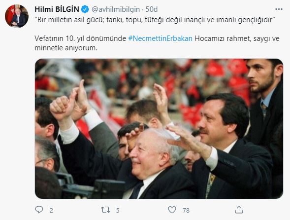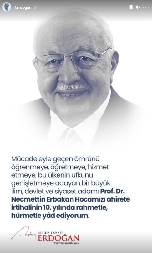 R. Tayyip Erdoğan "Mücadeleyle geçen ömrünü öğrenmeye, öğretmeye, hizmet etmeye, bu ülkenin ufkunu genişletmeye adayan bir büyük ilim, devlet ve siyaset adamı Prof. Dr. Necmettin Erbakan Hocamızı ahirete irtihalinin 10. yılında rahmetle, hürmetle yad ediyorum."