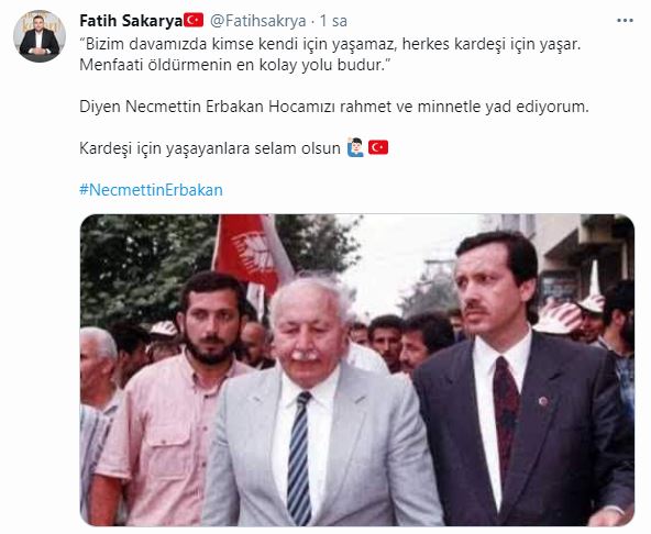Fatih Sakarya "“Bizim davamızda kimse kendi için yaşamaz, herkes kardeşi için yaşar. Menfaati öldürmenin en kolay yolu budur.” Diyen Necmettin Erbakan Hocamızı rahmet ve minnetle yad ediyorum. Kardeşi için yaşayanlara selam olsun"