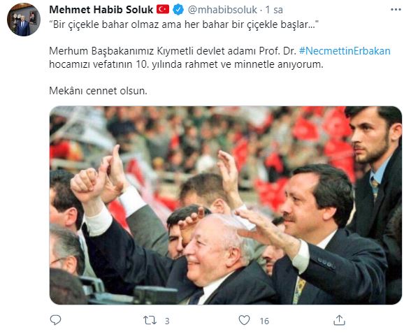 Habib Soluk "“Bir çiçekle bahar olmaz ama her bahar bir çiçekle başlar..." Merhum Başbakanımız Kıymetli devlet adamı Prof. Dr. #NecmettinErbakan hocamızı vefatının 10. yılında rahmet ve minnetle anıyorum. Mekânı cennet olsun."