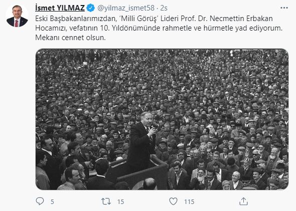 İsmet Yılmaz "Eski Başbakanlarımızdan, ‘Milli Görüş’ Lideri Prof. Dr. Necmettin Erbakan Hocamızı, vefatının 10. Yıldönümünde rahmetle ve hürmetle yad ediyorum. Mekanı cennet olsun."