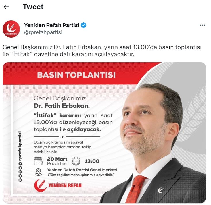Yeniden Refah Partisi Genel Başkanı Fatih Erbakan, 20 Mart Pazartesi günü ittifak kararını açıklayacak.