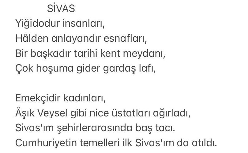 Yazar ve şairlik yapan Ercan Bulut'un Sivas için yazdığı bir şiir işse şu şekilde:
