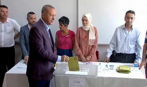 Kabine girerek tercihini yapan Erdoğan, oy zarfını sandığa attı. Cumhurbaşkanı Erdoğan'ın ardından eşi Emine Erdoğan da oyunu kullandı.