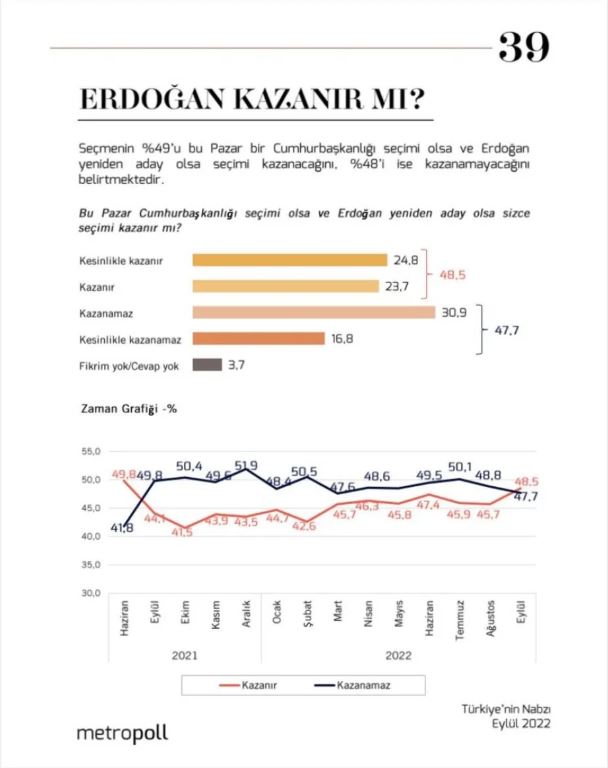 2023 seçimlerine 1 yıl gibi az bir süre kalırken tüm siyasi partiler çalışmalarına başladı. Kamuoyunun nabzını yoklayan araştırma şirketi MetroPOLL'ün son seçim anketinde Cumhurbaşkanı Erdoğan'ın tekrardan kazanacağı sorusunu vatandaşlara yöneltti. Erdoğan'ın kazanacağını söyleyenlerin oranı yüzde 49 oranında çıktı.