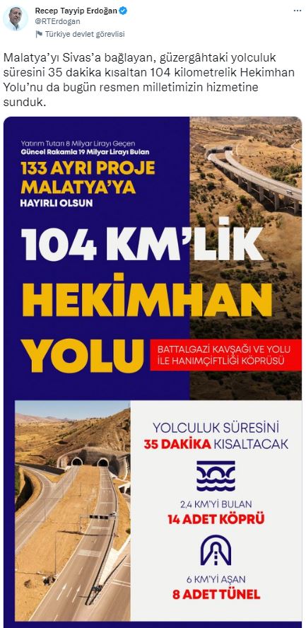Malatya’yı Sivas’a bağlayan, güzergâhtaki yolculuk süresini 35 dakika kısaltan 104 kilometrelik Hekimhan Yolu’nu da bugün resmen milletimizin hizmetine sunduk. Sabah