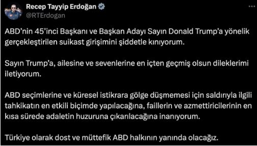 Cumhurbaşkanı Erdoğan, Trump'a düzenlenen suikastı, "ABD’nin 45’inci Başkanı ve Başkan Adayı Sayın Donald Trump’a yönelik gerçekleştirilen suikast girişimini şiddetle kınıyorum. " sözleriyle kınadı.