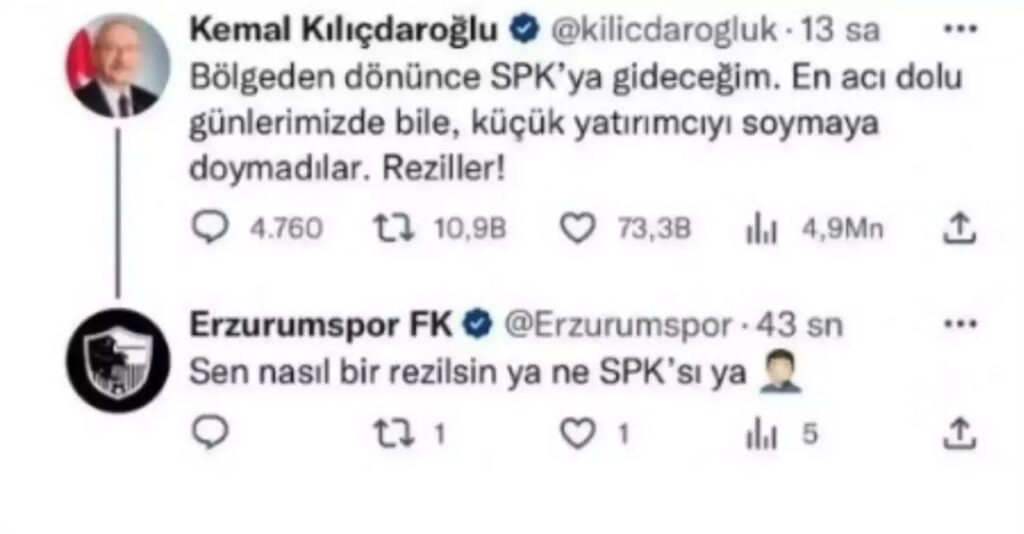 Kılıçdaroğlu'nun bu duyurusunun yer aldığı tweet'e Erzurumspor'un resmi hesabından yanıt geldi. Kulübün hesabından "Sen nasıl bir rezilsin ya ne SPK’sı ya” ifadelerinin yer aldığı çirkin bir mesaj paylaşıldı.