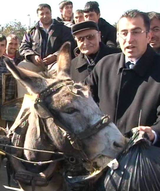 Akaryakıt pompasının yanına kadar eşek üstünde giden Başkan Danaoğlu, birden eşeğin hareket etmesi üzerine heyecanlanarak, "Tut, tut, Hasan abi tut" diyerek yuların tutulmasını istedi.