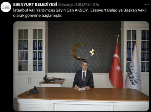 Esenyurt Belediyesi'nin resmi X hesabından yapılan paylaşımda, "İstanbul Vali Yardımcısı Sayın Can Aksoy, Esenyurt Belediye Başkan Vekili olarak görevine başlamıştır." ifadelerine yer verildi.