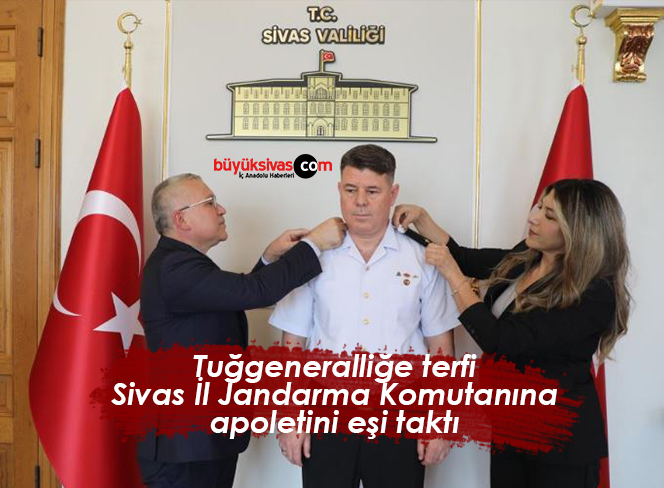 Albaylıktan tuğgeneralliğe terfi eden Sivas İl Jandarma Komutanı İdris Tataroğlu’nun apoletlerini eşi Fatma Tataroğlu ve Sivas Valisi Yılmaz Şimşek taktı.