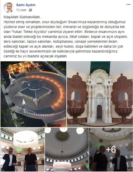 Hizmet etmiş olmaktan, onur duyduğum Sivas'ımıza kazandırmış olduğumuz yüzlerce eser ve projelerimizden biri, mimarisi ve özgünlüğü ile dünya'da tek olan 'Yukarı Tekke Ayyıldız' camimizi ziyaret ettim. Binlerce insanımızın aynı anda ibadet edeceği bu mekanda ayrıca, itikaf odaları, kapalı ve açık otoparkı, ders salonları, taziye salonları, kütüphanesi, cenaze yemeklerinin ikram edileceği kapalı ve açık alanları, seyir kulesi, duşa kabinleri ve daha bir çok özelliği ile hayır severlerimizin de katkılarıyla şehrimize kazandırdığımız camimiz bu yıl ibadete açılacak inşallah." paylaşımını yaparken "Sivas'ımıza kazandırmış olduğumuz yüzlerce eser ve projelerimizden biri" vurgusu ile de dikkatleri üzerine topladı.