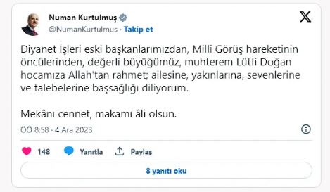 TBMM Başkanı Numan Kurtulmuş, sosyal medya hesabından yaptığı paylaşımda, "Eski Diyanet İşleri Başkanlarımızdan, Milli Görüş hareketinin öncülerinden, değerli büyüğümüz, muhterem Lütfi Doğan hocamıza Allah'tan rahmet, ailesine, yakınlarına, sevenlerine ve talebelerine başsağlığı diliyorum. Mekanı cennet, makamı ali olsun" ifadesini kullandı.