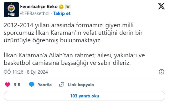 Fenerbahçe'nin eski basketbolcusu İlkan Karaman, Datça'da bir trafik kazasında hayatını kaybetti.