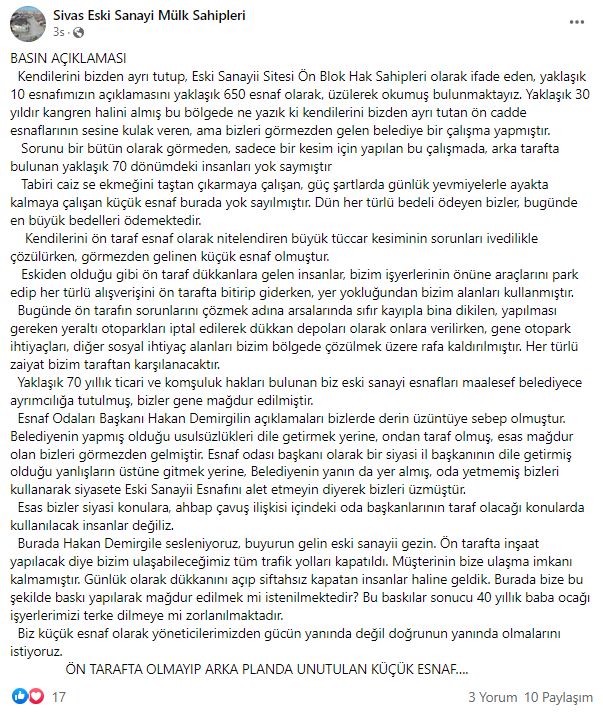 "Kendilerini bizden ayrı tutup, Eski Sanayii Sitesi Ön Blok Hak Sahipleri olarak ifade eden, yaklaşık 10 esnafımızın açıklamasını yaklaşık 650 esnaf olarak, üzülerek okumuş bulunmaktayız.