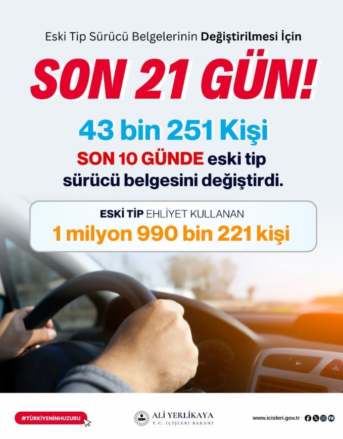 İçişleri Bakanı Ali Yerlikaya, eski tip sürücü belgelerinin yenilenmesi için son 21 güne girildiğini ve sürenin uzatılmayacağını duyurdu.