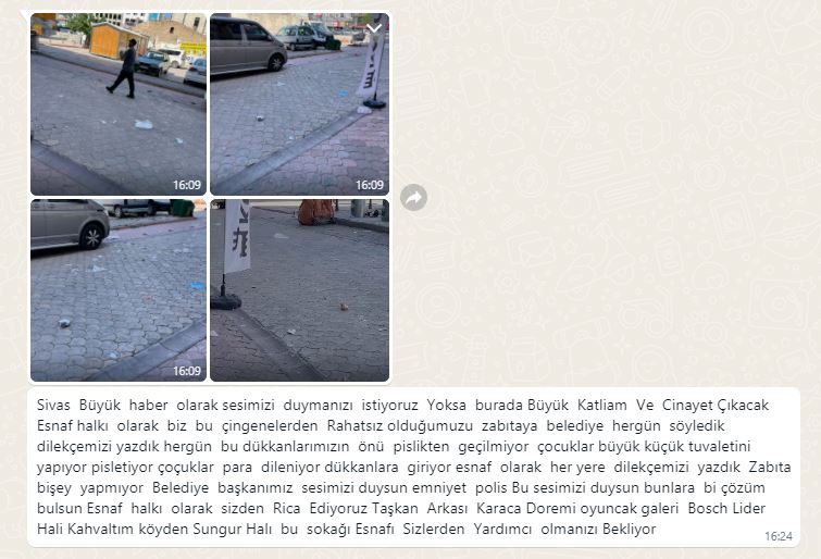 "Sivas Büyük haber olarak sesimizi duymanızı istiyoruz yoksa burada büyük katliam ve çinayet çıkacak... Esnaf halkı olarak biz bu çingenelerden rahatsız olduğumuzu zabıtaya belediye her gün söyledik dilekçemizi yazdık. Her gün bu dükkanlarımızın önü pislikten geçilmiyor. Çocuklar büyük küçük tuvaletini yapıyor pisletiyor. Çoçuklar para dileniyor, dükkanlara giriyor. Esnaf olarak her yere dilekçemizi yazdık. Zabıta birşey yapmıyor. Belediye Başkanımız sesimizi duysun. Emniyet polis sesimizi duysun. Bunlara bir çözüm bulsun. Esnaf halkı olarak sizden rica ediyoruz.