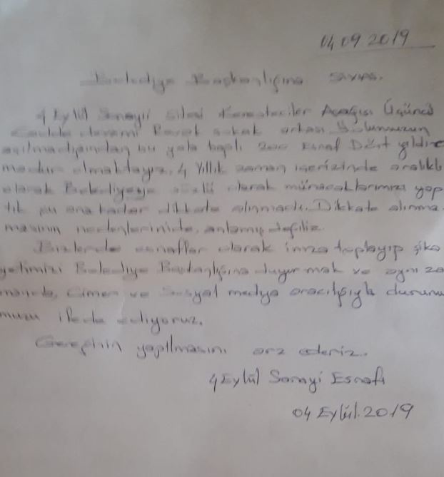 Esnaflar olarak belediyede söylemediğimiz kimse kalmadı. 4 Eylül de Sayın Cumhurbaşkanına şikayet edeceğiz."