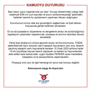 Fahiş fiyat artışlarının önüne geçmek amacı ile Kurumumuzca, TİGEM işletmelerinde hazır bulunan canlı kasaplık hayvanların yanı sıra, tedariki yapılmış kasaplık canlı hayvanlarla beraber 15 Ocak 2025 tarihine kadar 15 bin büyükbaş hayvan kesimi yapılacak ve kesilen bu hayvanlardan elde edilen taze karkas etler, uygun fiyattan PERDER üyesi marketlere, kasaplara ve et sanayicilerine ulaştırılacaktır. Piyasaya ürün arzı ile ilgili herhangi bir sorun söz konusu değildir."