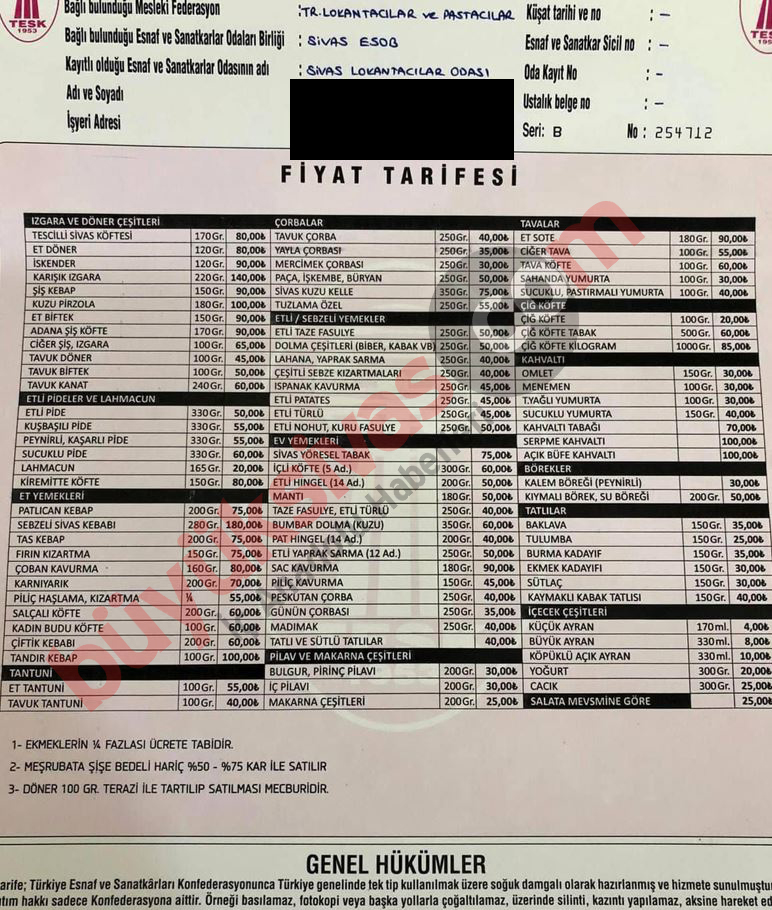 Sivas Lokantacılar ve Pastacılar Odası, gelen zamlar karşısında daha fazla direnemedi ve yeni fiyat tarifesini belirledi. Açıklanan yeni fiyat tarifesinde birçok yemek çeşidi neredeyse yüzde 100 zamlandı.